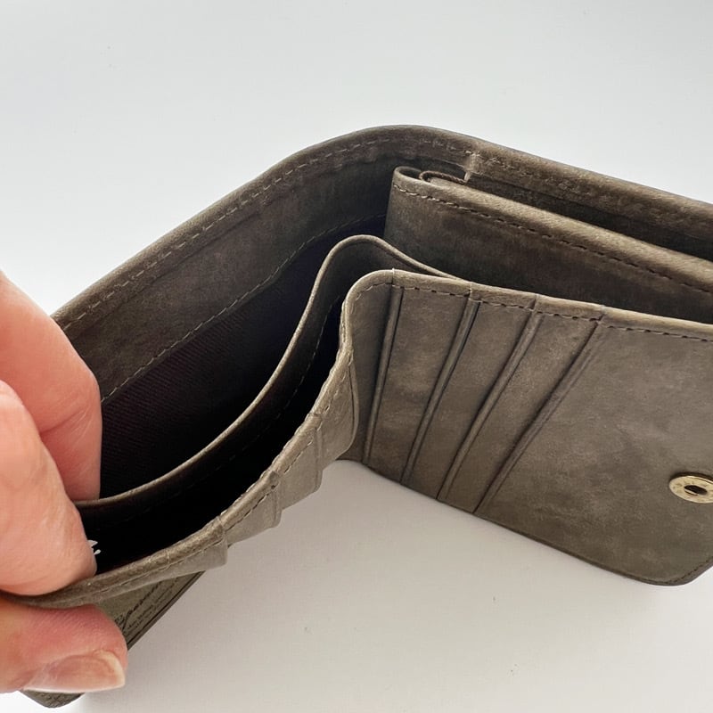 カード入れ×8枚、仕切り付きの札入れ、独立型の小銭入れ(中仕切り付き)と、コンパクトながら収納力抜群の設計です。