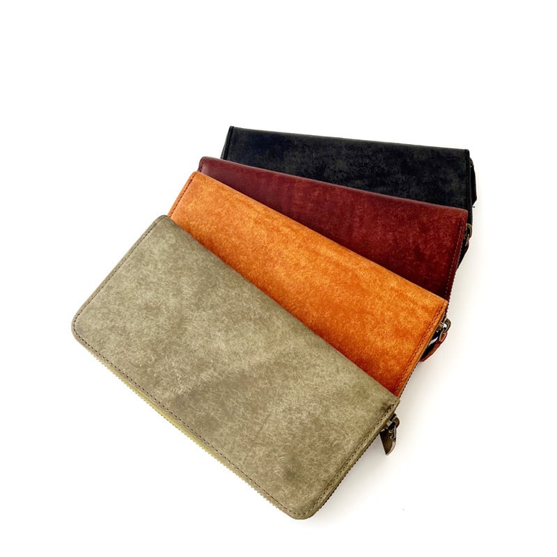 表面はあえて毛羽立たせた加工がされており、初めは少しザラつきのある手触りですが、使うほどに艶と深みが増し、**自分だけのエイジング(経年変化)を楽しめます。