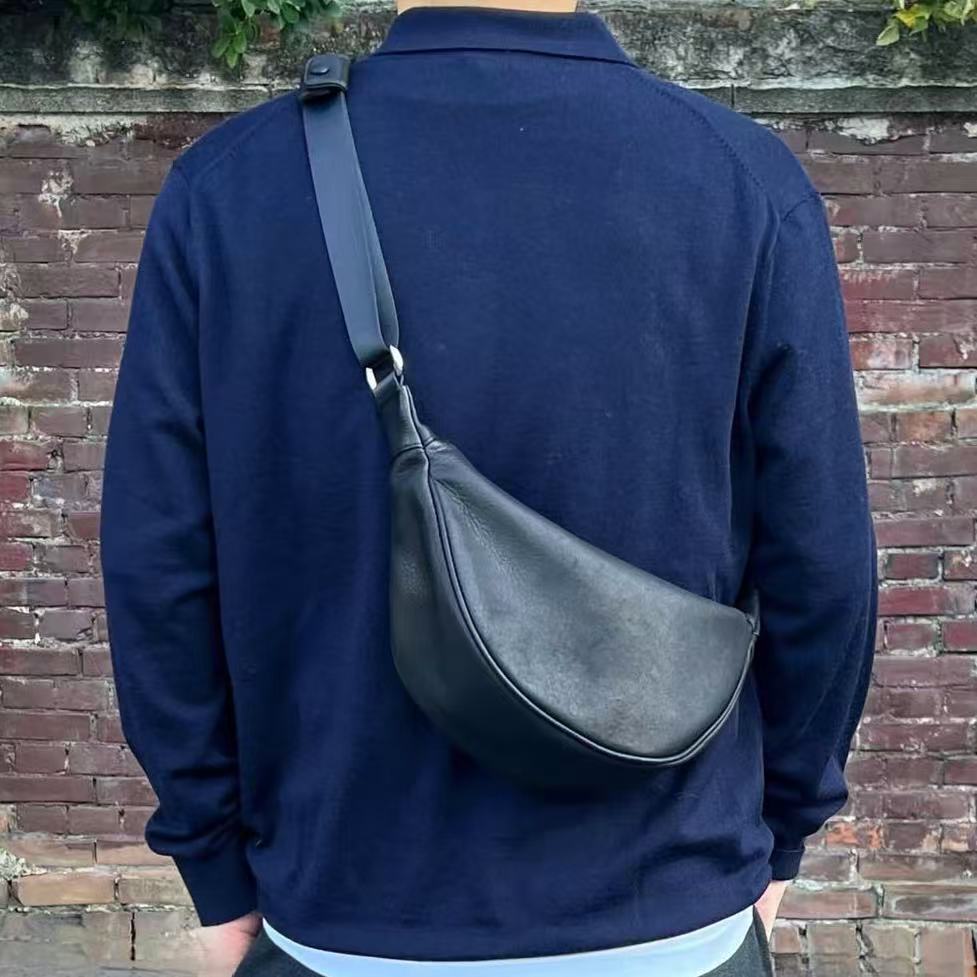 やわらかくしなやかなレザーが身体に自然にフィットする三日月型のショルダーバッグ。